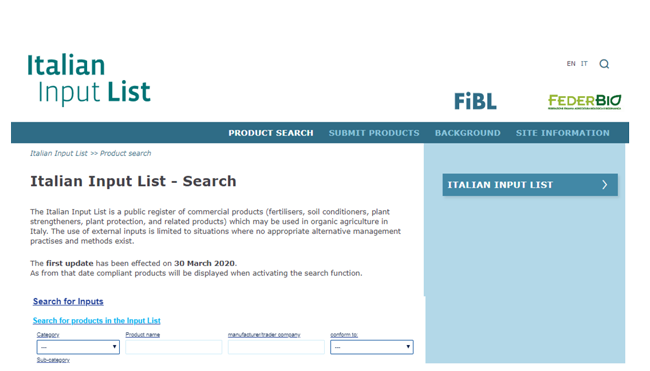 El Italian Input List es una lista pública a disposición para los agricultores que producen en agricultura orgánica, para los organismos de certificación, autoridades y productores de productos para la agricultura. Los agricultores orgánicos certificados pueden verificar en la lista qué productos se han evaluado positivamente con respecto a las regulaciones europeas y nacionales vigentes, pero también con respecto a criterios adicionales que analizan las peculiaridades y las necesidades de la agricultura orgánica italiana.