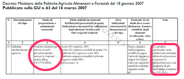 La Gelatina idrolizzata per uso agricolo è la prima matrice organica di cui è specificato anche il metodo ufficiale di identificazione, a garanzia della qualità d’origine: “la Gelatina idrolizzata viene identificata mediante elettrofocalizzazione su piastra di poliacrilammide con gradiente di pH preformato compreso tra 3,5 e 9,5”.