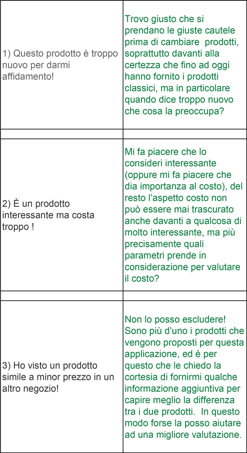 Quale tecnica utilizzare per rispondere efficacemente ad obiezioni genuine o strumentali? E’ troppo caro, l’ho visto a meno, i vostri tempi di consegna sono troppo lenti, mi hanno detto che il servizio di assistenza è inadeguato, voi fate pagare anche l’assistenza, il colore non mi piace, è bello ma forse troppo impegnativo per noi, ci devo pensare, con l’attuale fornitore non ho mai avuto problemi, e mille altre ancora.