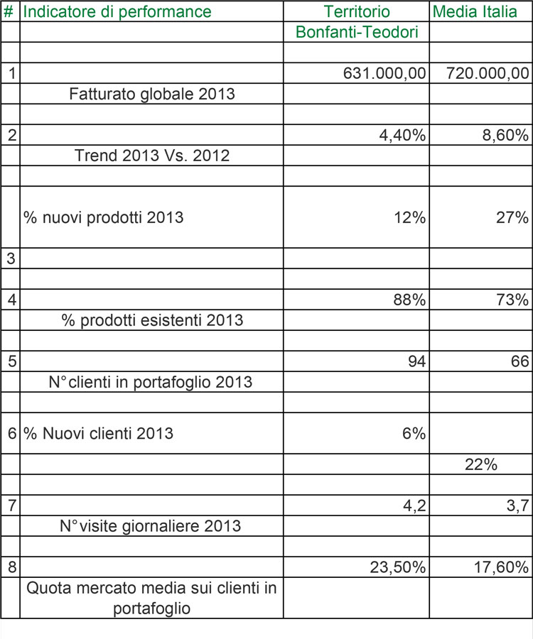 Bonfanti e Teodori rappresentano un team che opera da vari anni per una società che produce e commercializza vernici (ma potrebbe essere qualsiasi altro prodotto), distribuite attraverso una rete di rivenditori selezionati sul territorio. Bonfanti si occupa di gestire direttamente i rivenditori (sell in), Teodori invece realizza una intensa attività di promozione promuovendo l’azienda e i suoi servizi su architetti, imprese edili, imbianchini, tecnici etc. al fine di incrementare le vendite dei rivenditori (sell out). I rivenditori selezionati godono di una certa esclusiva territoriale di zona. Bonfanti e Teodori vantano entrambi anni d’esperienza nel settore e sono ben introdotti nel territorio. I loro rapporti con i clienti sono molto buoni pur tuttavia le vendite sono da un paio d’anni costantemente sotto gli obiettivi, tant’è che l’azienda ha deciso di rivolgersi a dei consulenti esperti per avere dei consigli su come intervenire nella zona. Immaginate per un attimo di essere voi, che state leggendo questo “Buono a sapersi”, quell’esperto che l’azienda ha incaricato. Avete chiesto di disporre di dati di vendita dell’area per poter analizzare i risultati.