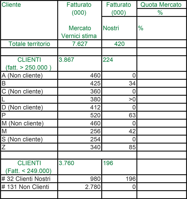 E’ opportuno avere un’idea di massima della potenzialità globale del mercato per raffrontarla alla potenzialità dei clienti in portafoglio. E deve essere compreso quanto questo potenziale del cliente, possa davvero esprimersi in rapporto alla sua strategia commerciale, alla sua preparazione tecnica, alla sua disponibilità finanziaria, alla sua organizzazione aziendale. Il rischio è che possa rimanere sempre e solo un potenziale.