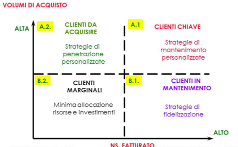 Attraverso questi due parametri i clienti possono essere divisi in quattro quadranti, ad ognuno dei quali corrispondono strategie d’azione diverse e intensità d’investimenti (visite e altre risorse) ugualmente differenziate.