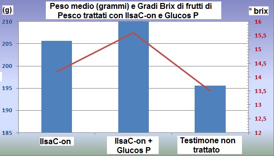 E’ ormai assodato che 5 applicazioni di ILSAC-ON, nelle fasi fenologiche di scamiciatura, frutto noce, frutto ingrossato, indurimento del nocciolo ed invaiatura, favoriscono un notevole incremento del peso dei frutti rispetto a piante di pesco non trattate.