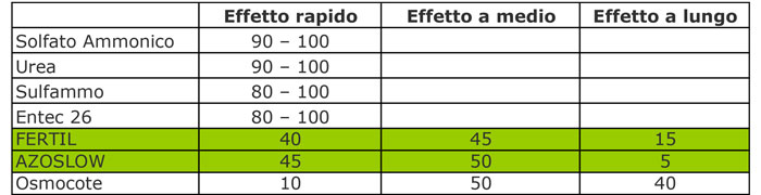 Una indagine condotta nel 2004 dal CRA, (Centro per le Ricerche in Agricoltura), su alcuni concimi azotati, ha studiato la disponibilità dei concimi (in %) per fasce di tempo.