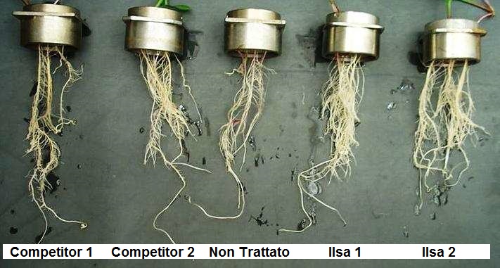 Qui di seguito i primi risultati del confronto tra apparati radicali di mais in idroponica, trattate con diverse concentrazioni dell’idrolizzato enzimatico di Fabaceae di ILSA, rispetto ad un testimone ed a due prodotti in commercio ad azione fitostimolante.