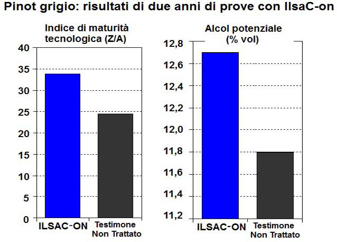 Figura 1. Risultati di due anni di prove su Pinot Grigio in Friuli. Le applicazioni di ILSAC-ON, biostimolante a base di Idrolizzato enzimatico di Fabaceae, hanno consentito il miglioramento della qualità del mosto.