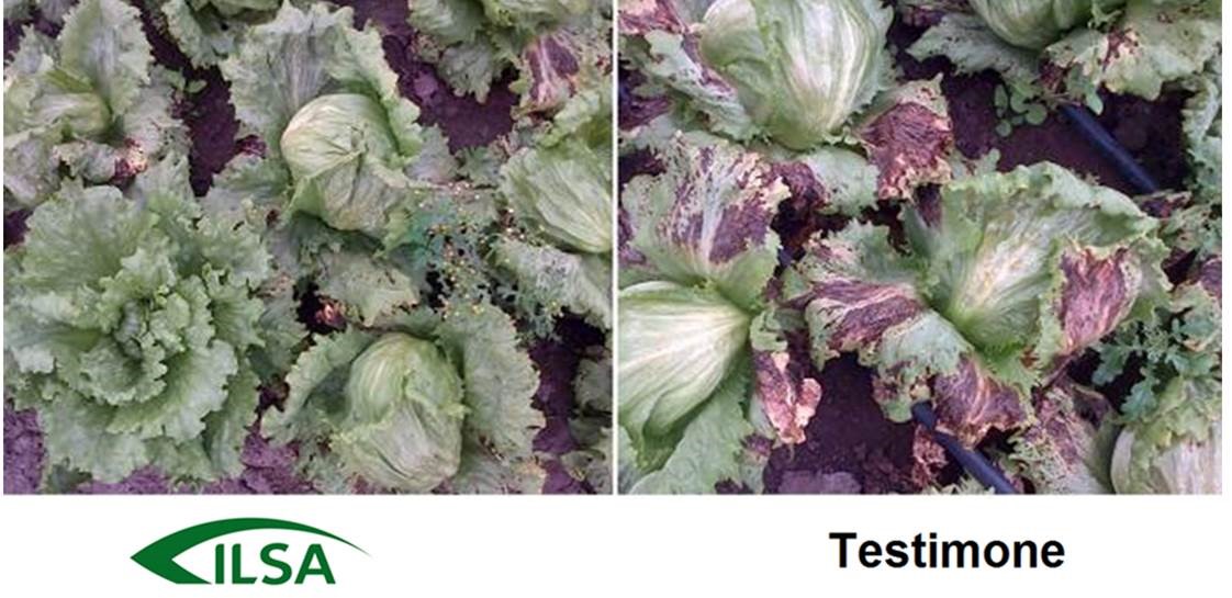 Nella foto sotto, un esempio evidente dell’effetto di ILSATERMIKO sulla riduzione di danni da freddo su lattuga, var. Desert Storm. Gli specifici amminoacidi liberi anti-stress, in particolare prolina, acido glutammico, serina, valina, consentono l’aumento della concentrazione della soluzione all’interno delle cellule, abbassando il punto critico di congelamento e aiutando la regolazione osmotica.