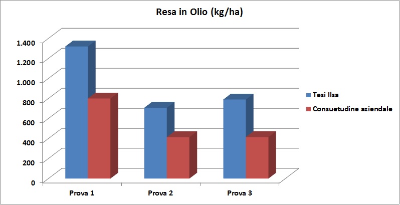 Nel grafico sottostante, sono riportati i risultati ottenuti in termini di produzione di olio ad ettaro, risultanti dall’aumento sia della resa in olive sia dalla resa in olio. A prescindere dall’annata, sia dal punto di vista climatico che di alternanza produttiva, la strategia di ILSA per le fasi finali ha permesso di ottenere, al frantoio, più olio e di qualità, rispetto alla consuetudine aziendale caratterizzata dall’uso di concimi minerali (urea, acido fosforico, nitrato di potassio).