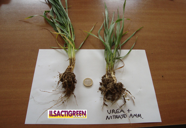 A fianco un confronto tra piante di frumento duro (var. Atoris), in fase di levata, in cui è stato usato Ilsactigreen Start Granulare alla semina. E’ evidente la differenza di lunghezza delle radici e lo sviluppo maggiore dell’intera pianta, a confronto con il testimone in cui sono stati usati semplici concimi minerali.