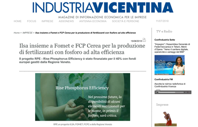 Industria Vicentina riporta la notizia sul progetto RPE - Rise Phosphorus Efficiency. La disponibilità di fosforo, macro-elemento essenziale per la nutrizione dei vegetali, sarà nel prossimo futuro sempre più critica. Ilsa è impegnata, assieme a Fomet e a FCP Cerea, in un progetto che mira ad aumentare l'efficienza del fosforo per la produzione di fertilizzanti.