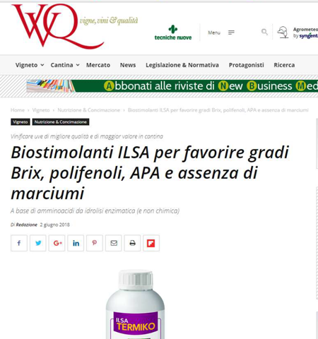Vigne Vini e Qualità dedica uno spazio ai biostimolanti ILSA a base di amminoacidi da idrolisi enzimatica (e non chimica) e di idrolizzato enzimatico di Fabaceae, che applicati per via fogliare ed in specifici momenti del ciclo colturale, esaltano le caratteristiche qualitative agendo, in maniera del tutto naturale, sulla fisiologia della vite....
