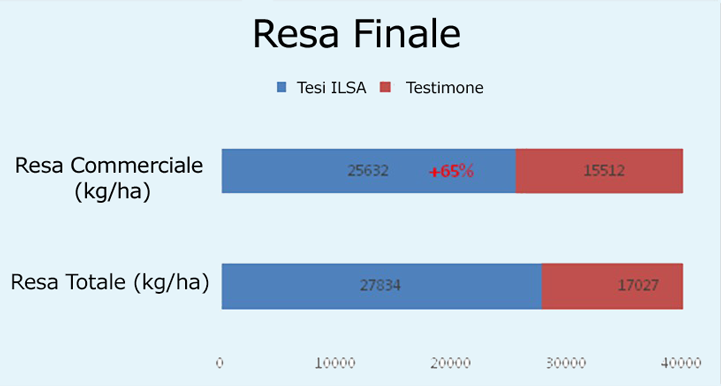- Un incremento della produzione alla raccolta (figura 1), corrispondente ad una resa commerciale maggiorata del 65% rispetto al testimone.